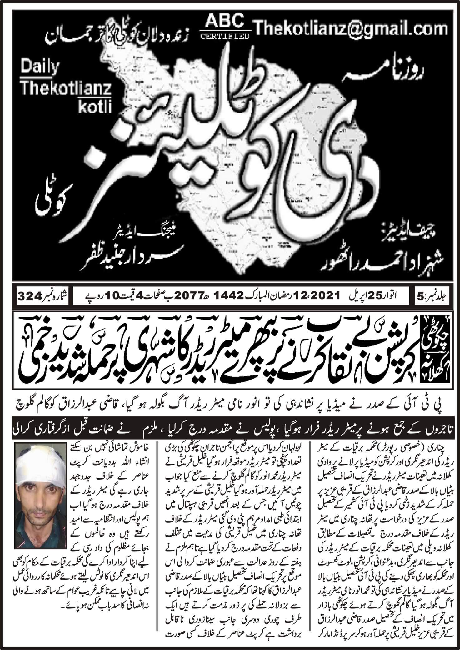 چناری (خصوصی رپورٹر)محکمہ برقیات کے میٹر ریڈر کی اندھیر نگری اور کرپشن کو میڈیا پر لانے پر وادی کھلانہ میں تعینات میٹر ریڈر نے تحریک انصاف تحصیل ہٹیاں بالا کے صدر قاضی عبدالرزاق کے قریبی عزیز پر حملہ کر کے شدید زخمی کردیا پی ٹی آئی کشمیر کے تحصیل صدر کے عزیز کی درخواست پر تھانہ چناری میں میٹر ریڈر کے خلاف مقدمہ درج ۔تفصیلات کے مطابق کھلانہ ویلی میں تعینات محکمہ برقیات کے میٹر ریڈر کی جانب سے اندھیر نگری، بدعنوانی ،کرپشن، لوٹ کھسوٹ اور محکمہ کو بھاری پھکی دینے کی پی ٹی آئی تحصیل ہٹیاں بالا کے صدر نے میڈیا پر نشاندہی کی تو محمد انور نامی میٹر ریڈر آگ بگولہ ہو گیا گالم گلوچ کرتے ہوئے چکوٹھی بازار میں تحریک انصاف کے تحصیل صدر قاضی عبدالرزاق کے قریبی عزیز خلیل قریشی پر حملہ آور ہو کر سر پر ڈنڈا مار کر لہو لہان کر دیا اس پر موقع پر انجمن تاجران چکوٹھی کی بڑی تعداد پہنچی تو میٹر ریڈر موقعہ فرار ہو گیا خلیل قریشی نے میٹر ریڈر محمد انور کو گالم گلوچ کرنے سے منع کیا جواب میں میٹر ریڈر حملہ آور ہو گیا خلیل قریشی کے سر پر شدید چوٹیں آئیں جس کے بعد انھیں قریبی ہسپتال میں ابتدائی طبی امداد مرہم پٹی دی گئی میٹر ریڈر کے خلاف تھانہ چناری میں خلیل قریشی کی مدعیت میں مختلف دفعات کے تحت مقدمہ درج کر دیا گیا ہے تاہم ملزم نے ہفتہ کے روز عدالت سے عبوری ضمانت کروا لی اس موقع پر تحریک انصاف تحصیل ہٹیاں بالا کے صدر قاضی عبدالرزاق کا کہنا تھا کہ محکمہ برقیات کے ملازم کی جانب سے بزدلانہ حملے کی پر زور مذمت کرتے ہیں ایک طرف چوری دوسری جانب سینازوری ناقابل برداشت ہے کرپٹ عناصر کے خلاف کسی صورت خاموش تماشائی نہیں بن سکتے انشاء اللہ بددیانت کرپٹ عناصر کے خلاف جدوجہد جاری رہے گی میٹر ریڈر کے خلاف مقدمہ درج ہو گیا اب ہم پولیس اور انتظامیہ سے امید رکھتے ہیں وہ ظالموں کے بجائے مظلوم کی داد رسی کے لیے اپنا کردار ادا کرے گی محکمہ برقیات کے حکام کو بھی اس اندھیر نگری کا نوٹس لیتے ہوئے محکمانہ کارروائی عمل میں لانی چاہیے تانکہ غریب عوام کے ساتھ ہونے والی نہ انصافی کا سد باب ممکن ہو پائے ۔